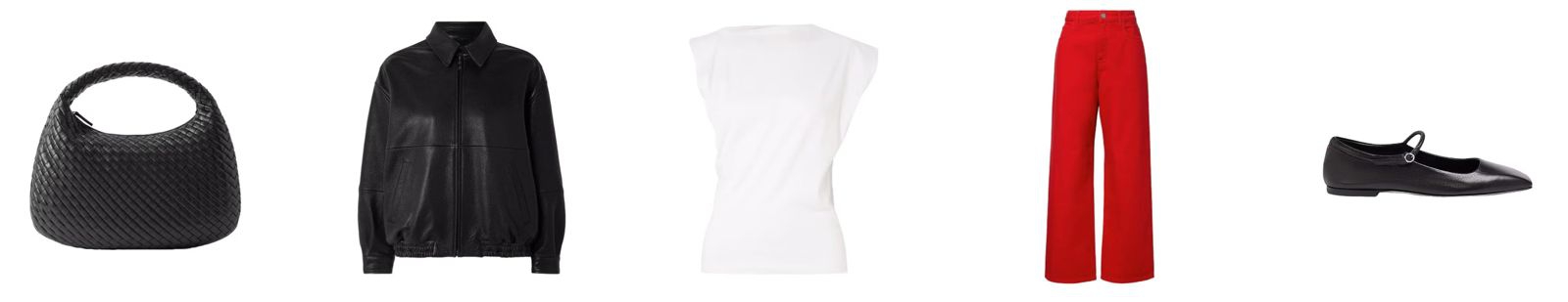 Kiri ke kanan: Tas Bahu Kulit Bottega Veneta Medium/Jaket Kulit Doran/Atasan Asimetris Beth/Jeans Wide-Leg Mid-Rise/Sepatu Flat Mary Jane Kulit Uma