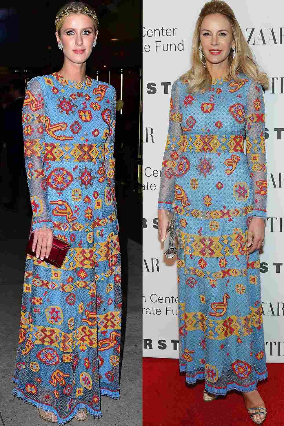 Nicky Hilton dan Dee Ocleppo-Hilfiger sama-sama mengenakan gaun Valentino yang berwarna biru menawan dan aksesori clutch.