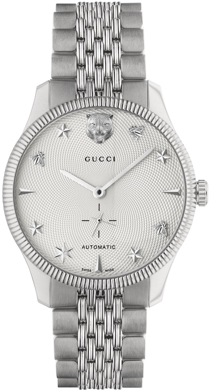 Tambahan 2 model jam tangan di seri jam tangan Gucci G-Timeless dihadirkan rumah mode Gucci dengan ukuran sebesar 40mm. Jam tangan yang didesain menggunakan bracelet strap dari bahan stainless steel ini dihiasi dengan dial yang dibubuhi ornamen feline head khas Gucci.