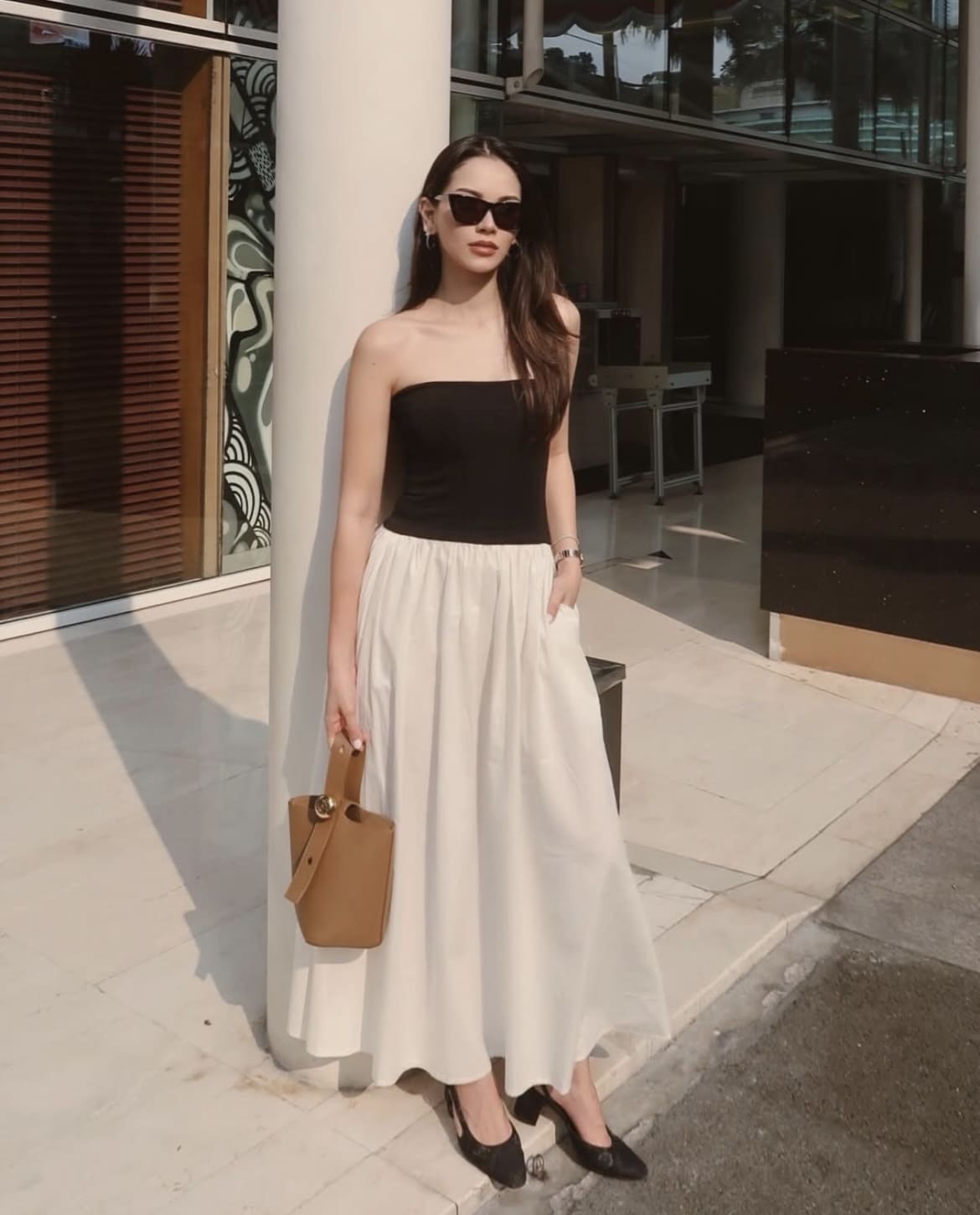 Berikutnya, drop-waist dress hitam-putih jadi pilihan untuk nuansa siang yang lebih formal namun tetap ringan. Bucket bag Loewe berwarna cokelat, kacamata gelap, dan perhiasan halus mempertegas kesan effortless elegance yang menjadi ciri khas gaya Alyssa.