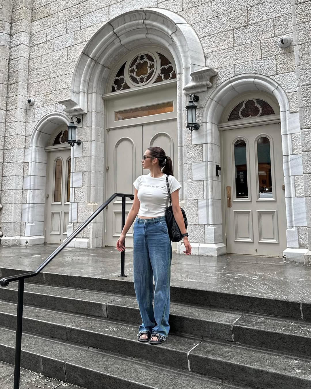 Kaos putih fitted dipadukan dengan wide leg jeans dan sandal slide hitam. Gaya super santai tapi tetap cakep buat city stroll, vibes nya timeless dan bisa dipakai siapa aja, kapan aja.