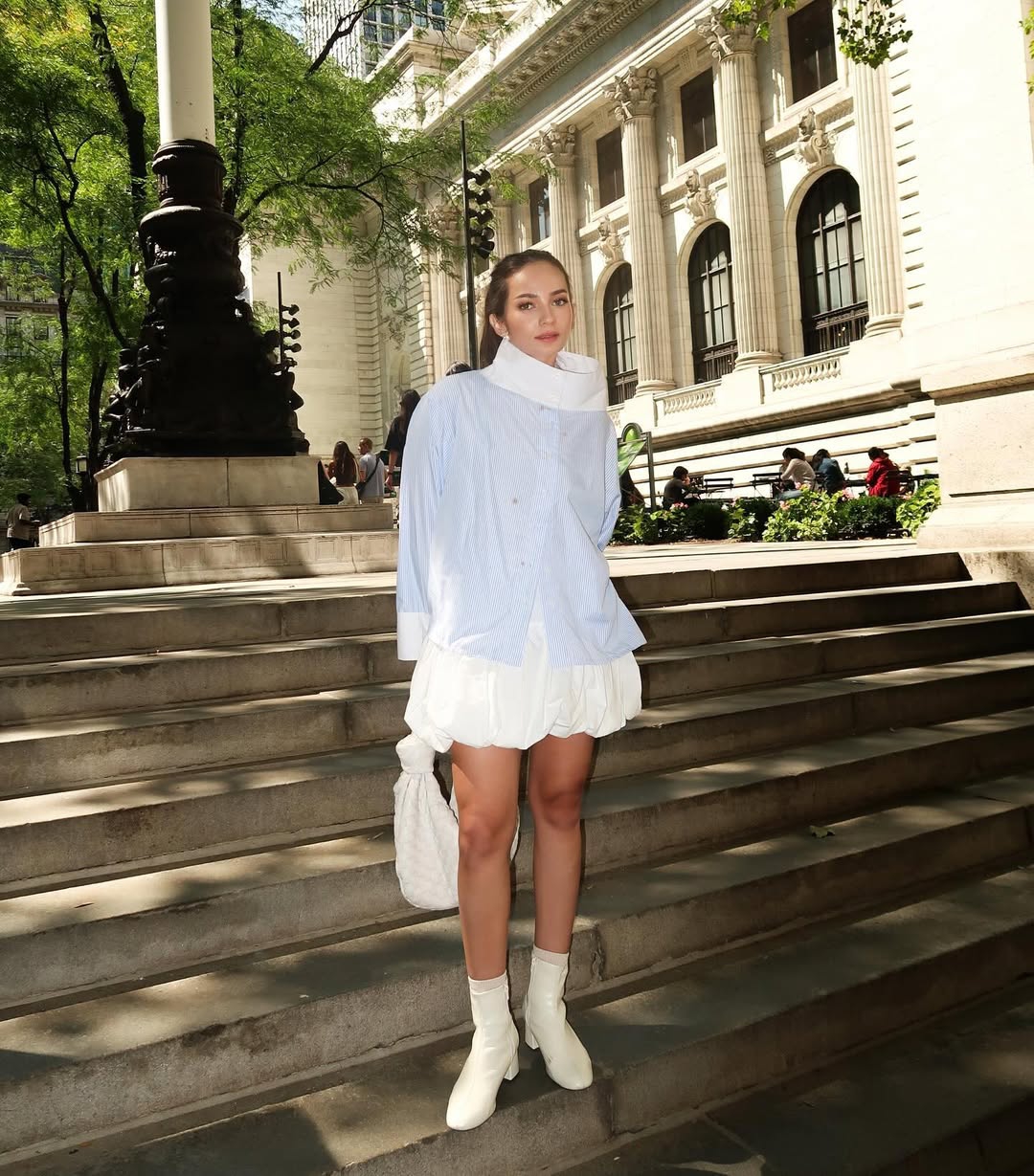 Paduan kemeja oversized bergaris biru, rok mini putih model balon, ankle boots putih, dan tas rajut putih bikin look ini playful tapi tetap chic. Cocok banget buat jalan-jalan di kota atau nongkrong stylish.