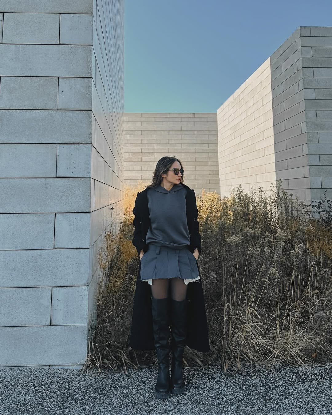 Hoodie abu-abu, mini skirt pleats, coat hitam panjang, stocking hitam, dan knee high boots bawa nuansa dark academia tapi tetap modern. Pas banget buat cuaca dingin atau hunting foto di area industrial.