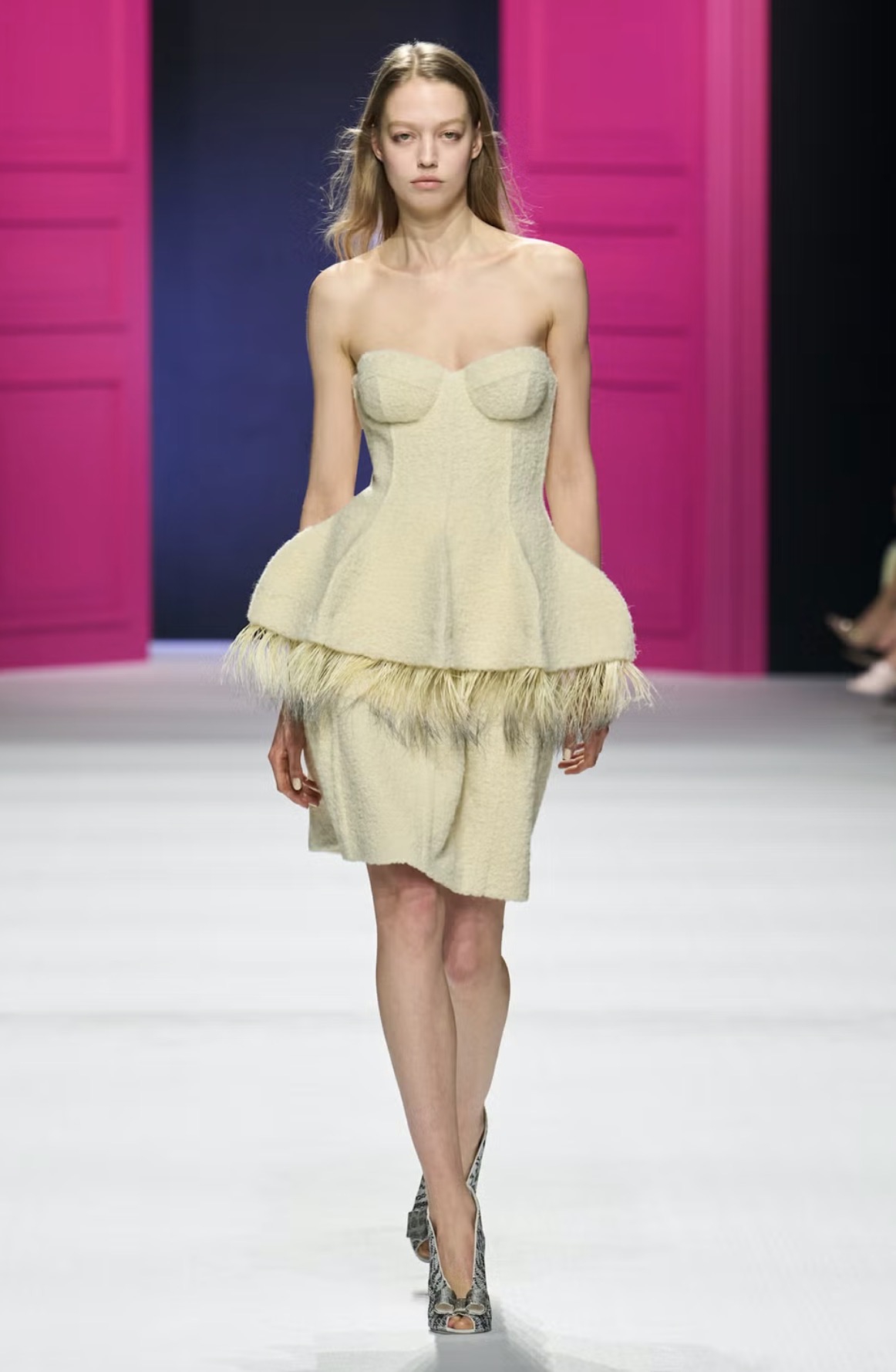Desain gaun ini terdiri dari bodice bergaya bustier dengan pinggang peplum yang terstruktur, dibentuk dengan garis tegas seolah-olah terbuat dari plester. Bagian bawahnya dihiasi dengan deretan bulu kuning mencolok dengan ujung gelap, yang tidak hanya mengikuti tren feather, tetapi juga menyerupai tanaman gurun dari dunia alien Dune. Bulu dua warna tersebut mengelilingi miniskirt krem senada di bagian dalam, sementara Zendaya melengkapi tampilannya dengan anting hoop perak kecil.