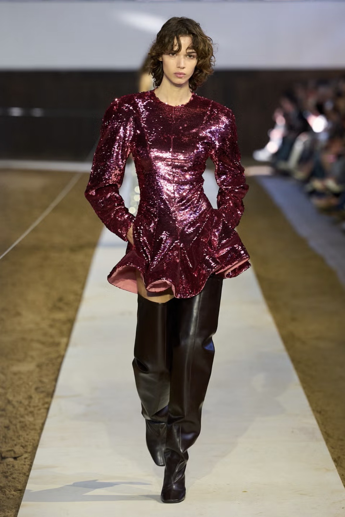 Ditata oleh Erin Walsh, sepatu bot tersebut dipadukan dengan minidress merah muda terang yang sama seperti yang ditampilkan di runway. Gaun berpayet dengan potongan crew-neck ini memiliki bahu lebar serta rok mengembang dengan lipatan dramatis—menciptakan tampilan yang mencuri perhatian dan menjadi pembuka kuat untuk tur pers ini.