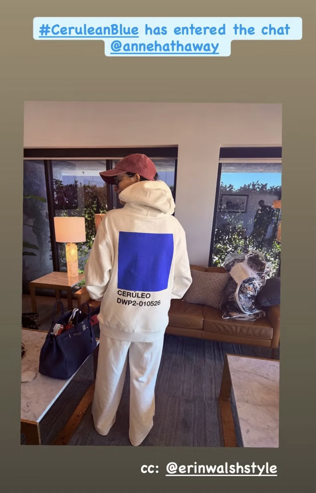 Dipadukan dengan celana sweatpants warna tulang dari Alo, tampilan ini jauh dari sekadar kasual biasa. Pada bagian belakang hoodie tersebut, terdapat blok warna biru menyerupai cetakan printer, dengan tulisan “cerulean” dalam bahasa Spanyol. Tentu, siapa yang bisa melupakan adegan ketika Miranda Priestly (diperankan Meryl Streep) menjelaskan kepada Andy bahwa sweater cerulean miliknya merupakan hasil langsung dari tren mode tingkat tinggi? (Menariknya, warna ini kembali menjadi tren saat ini.)