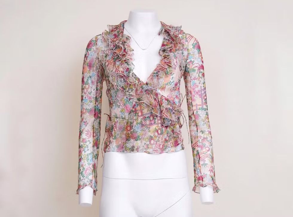 Atasan model wrap berbahan sifon yang agak transparan ini dicetak dengan motif bunga-bunga cerah bergaya kartun dalam warna-warna pastel seperti merah muda, biru, hijau, oranye, dan lainnya. Desainnya ditandai dengan rumbai-rumbai ketat yang membentang di sepanjang garis leher yang rendah. Di dalam motif yang ramai itu, tampak juga pola jembatan dan pagar kayu.