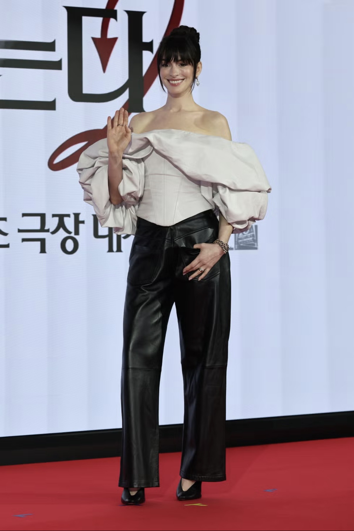 Press tour DWP2 baru-baru ini singgah di Seoul, Korea Selatan, di mana Anne Hathaway menghadiri serangkaian acara dengan dua tampilan leather yang mencuri perhatian, yang ditata oleh Erin Walsh.
