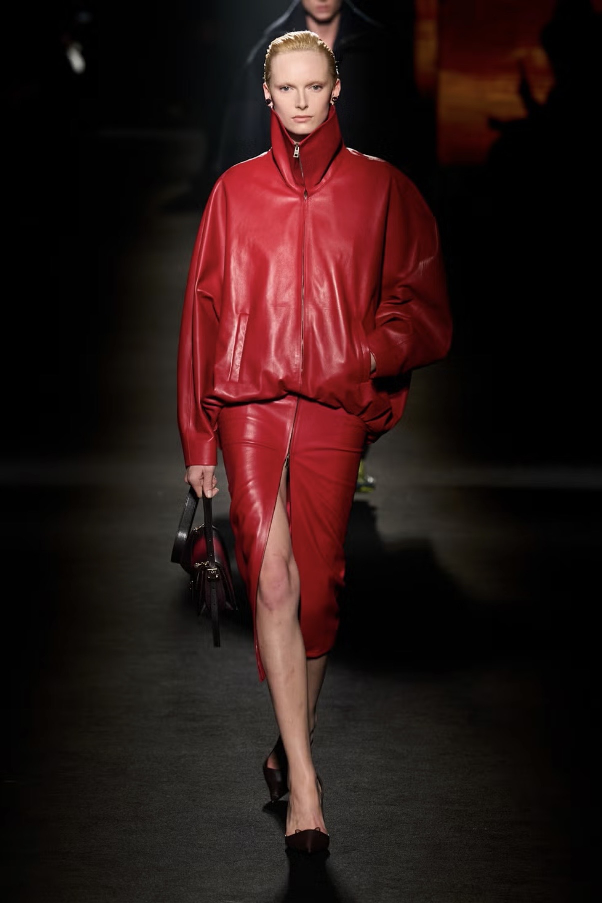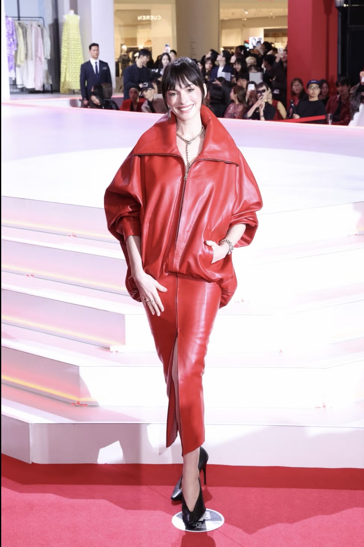 Anne Hathaway kemudian berganti ke set kulit merah dari Balenciaga.