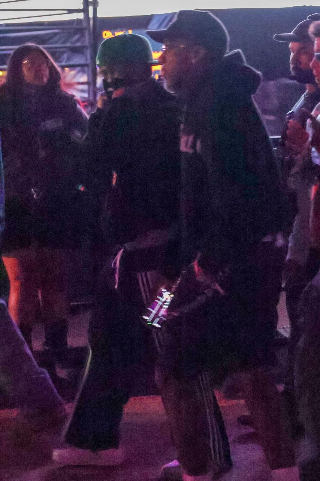 Mengenakan topi hijau dan pakaian berlapis hitam, menuju ke penampilan Justin Bieber.