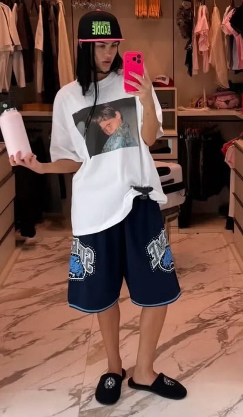 Mengenakan kaus dan celana pendek denim di Nylon House di Gurun.