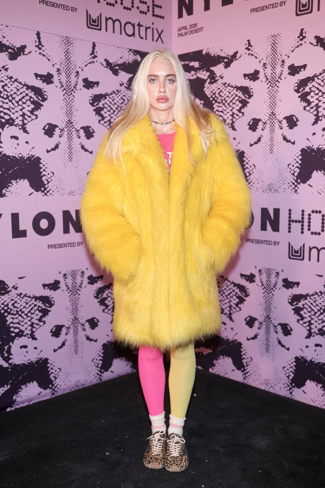 Di Nylon House di Gurun dengan mantel bulu kuning dan celana ketat merah muda dan kuning.