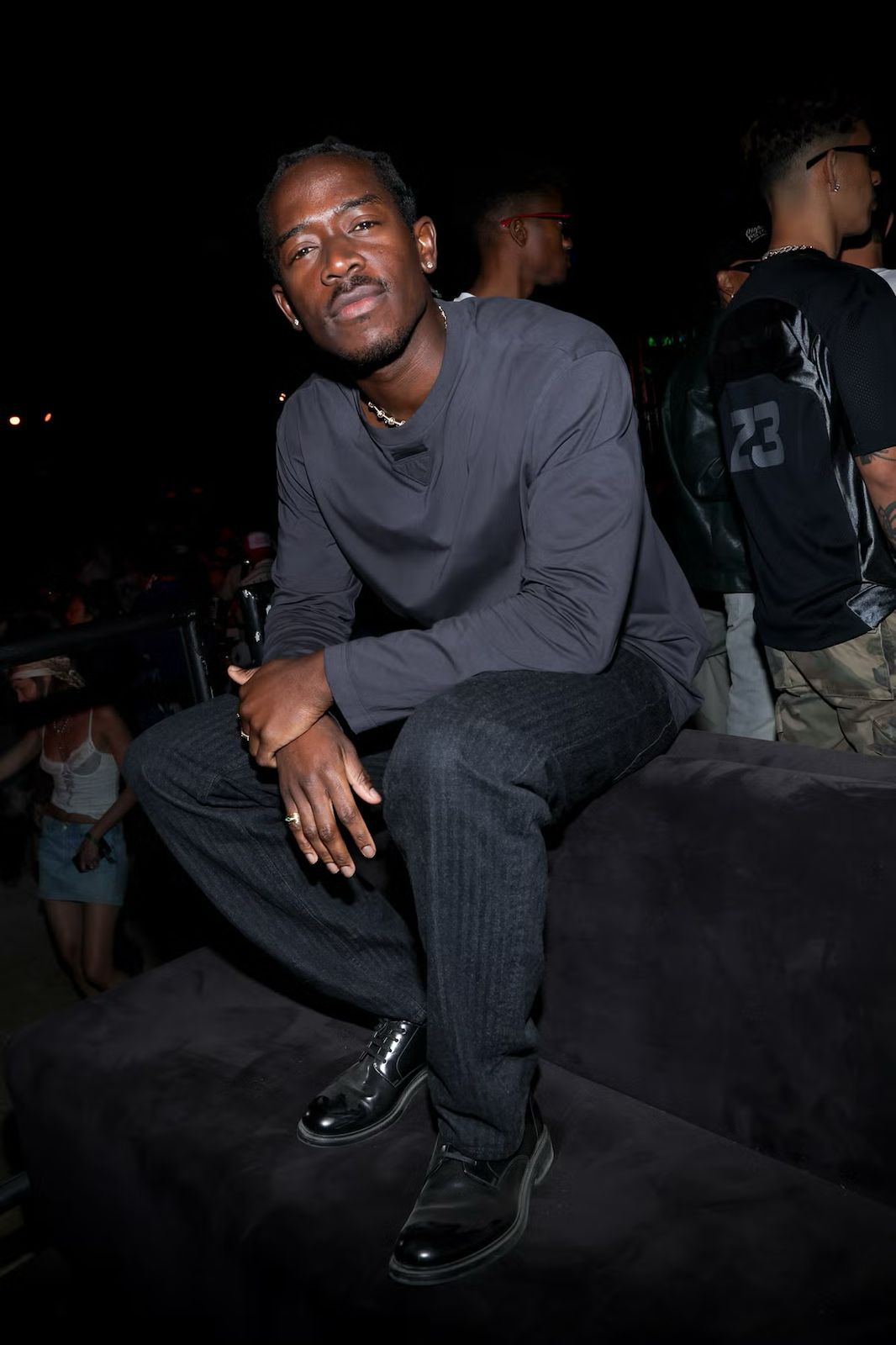 Di Festival Revolve mengenakan kaus hitam, celana pendek sutra, dan sepatu bot hitam.