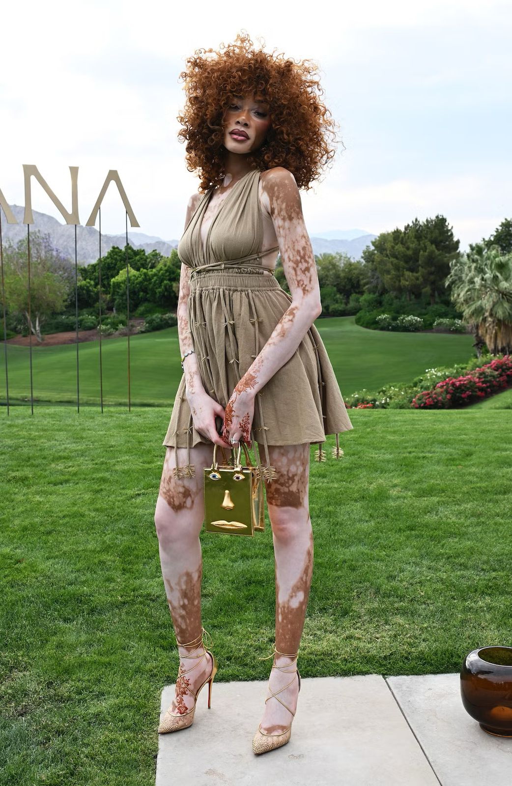 Model tersebut mengenakan gaun halter pendek ke perayaan 15 tahun CARAVANA dengan sepatu hak tinggi.