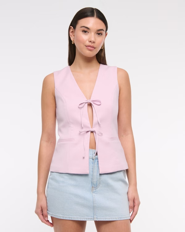 Penampilan gaya coquette dengan versi kasual dan chic bisa didapatkan dengan menggunakan rompi berwarna pink pastel. Detail tali berbentuk pita pada bagian depan vest ditambah dengan warna pink pastel memberikan kesan lembut dan manis. Untuk meningkatan penampilan, tambahkan aksesoris seperti kalung mutiara atau anting kecil. Tampilan ini memberikan kesan feminin dengan aura yang manis dan romantis.