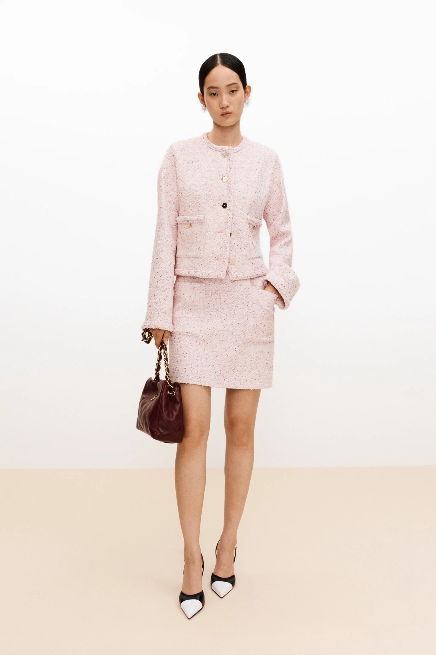 Untuk mewujudkan gaya coquette dengan penampilan yang timeless dan berkelas, pemilihan jaket tweed juga sangat direkomendasikan. Desain dengan sentuhan feminin seperti warna pastel (pink atau krem), detail kancing mutiara, ruffle, atau potongan crop dapat memberikan kesan manis, romantis, dan elegan yang sesuai dengan gaya coquette.