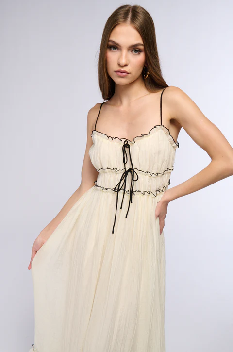 Gaun seperti ini sangat cocok jika ingin tampil feminin dengan sentuhan vintage. Aksen ruffle dan tali dan pita hitam kecil memberikan detail kontras yang manis. Gaun dengan bahan satin seperti ini dapat dipadukan dengan sepatu ballet flats hitam, tas clutch, dan pita rambut berukuran besar untuk memperkuat kesan coquette.