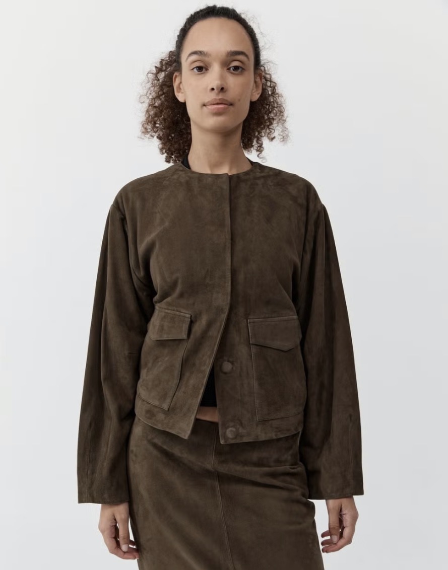 Atasan tersebut menjadi dasar sempurna untuk keseluruhan tampilanny, set dua potong berbahan suede dari St. Agni, terdiri dari jaket bomber khaki dan rok pensil. Outerwear-nya menghadirkan siluet santai yang sedikit oversized, dengan neckline tanpa kerah dan lengan berbentuk cocoon. Desainnya dilengkapi flap patch pockets untuk sentuhan utilitarian, serta kancing magnet bulat yang dibiarkan terbuka.