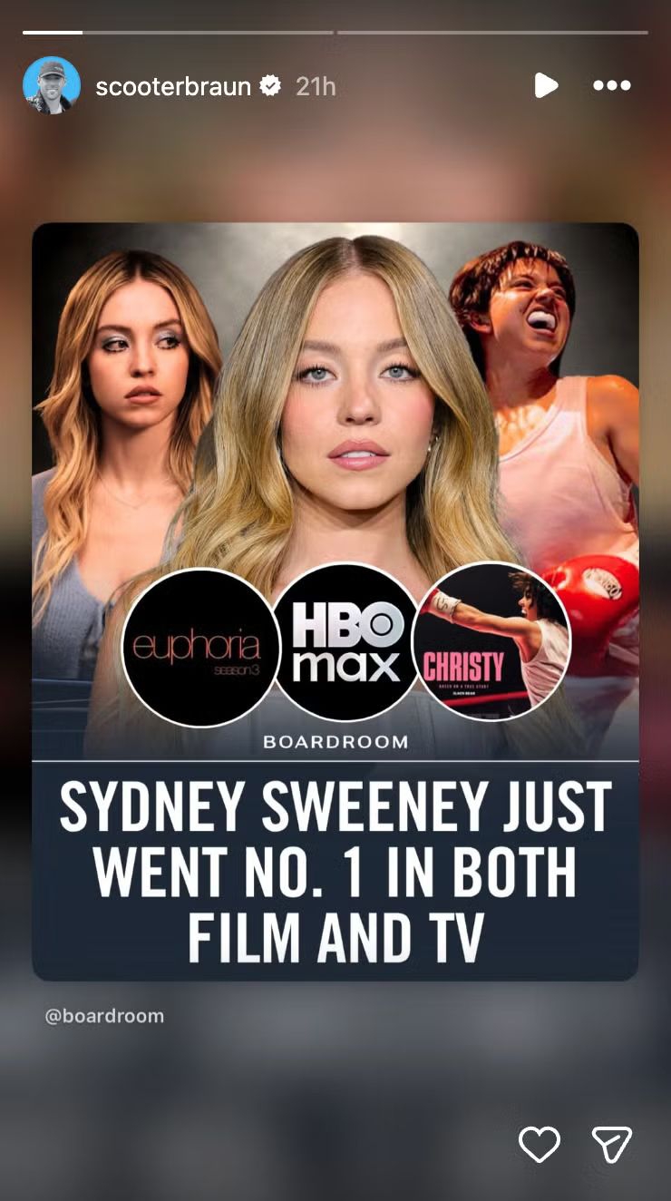 Di hari yang sama, mantan talent manager tersebut juga membagikan sebuah grafik yang merayakan bahwa Sydnet saat ini memiliki No. 1 show (Euphoria) dan No. 1 film (Christy) di HBO Max. Di kolom komentar unggahan asli dari Boardroom, sang aktris turut merayakan pencapaian itu dengan menulis: “💪💪❤️”.
