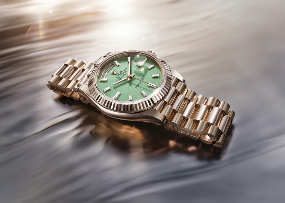 Day Date 40 memperkenalkan Jubilee Gold, material baru dengan rona yang lebih lembut. Dipadukan dengan dial aventurine hijau, jam ini memancarkan kilau yang tidak berlebihan namun tetap memiliki kehadiran yang kuat.