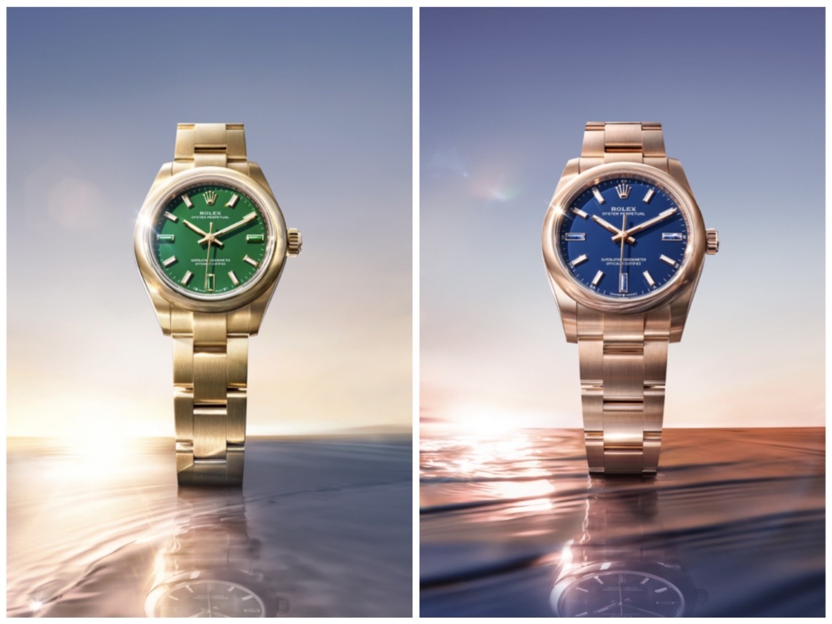 Pada Oyster Perpetual 28 dan 34, pendekatannya terasa lebih halus. Keduanya hadir dalam emas dengan dial berwarna batu yang lembut. Penggunaan natural stone sebagai penanda jam menghadirkan nuansa yang hampir seperti perhiasan, namun tetap berada dalam garis desain yang bersih.