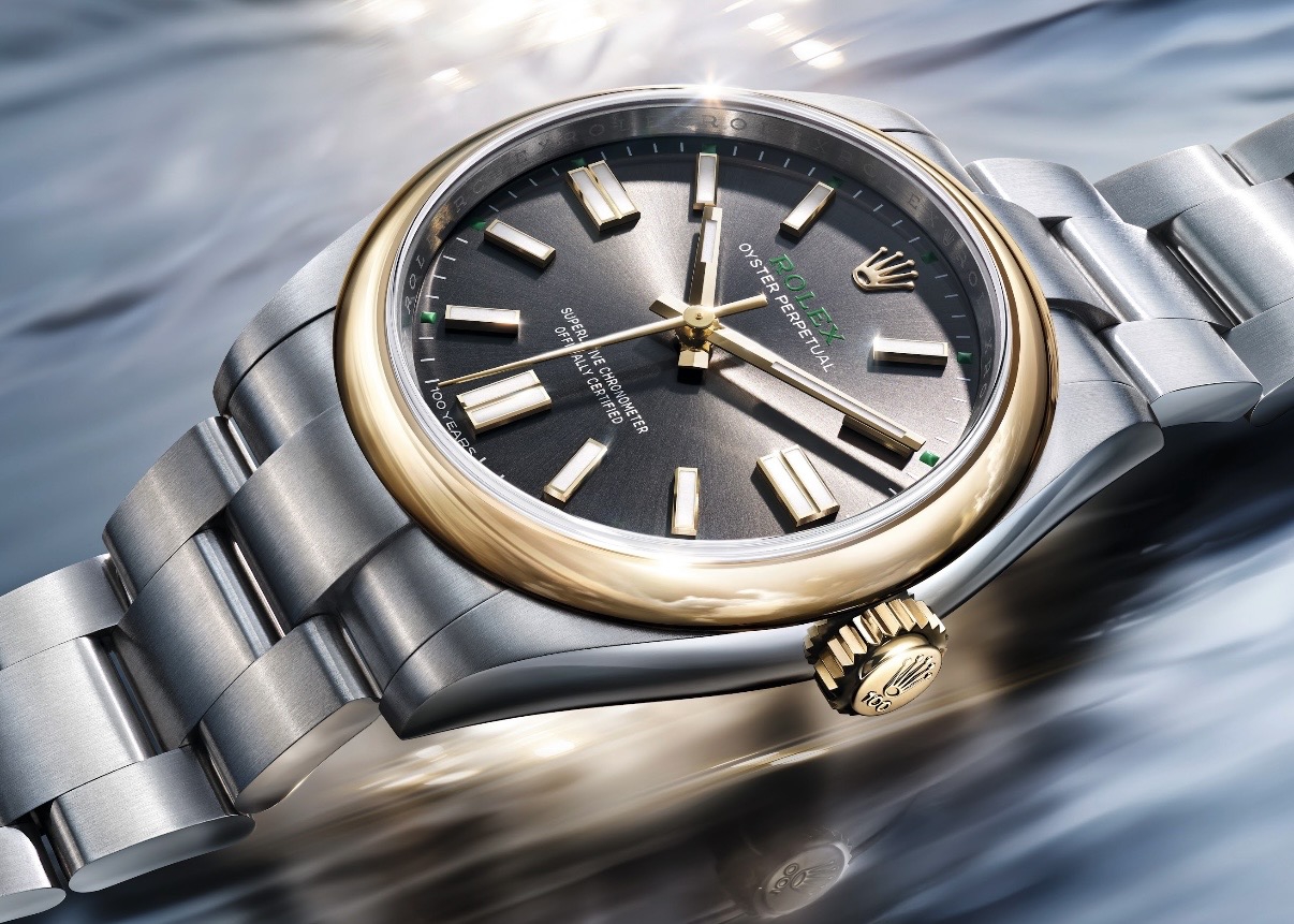 Dalam balutan Rolesor yang memadukan Oystersteel dan yellow gold, Oyster Perpetual 41 membawa penanda khusus pada dial dan crown sebagai refleksi satu abad Oyster. Penampilannya tetap sederhana, namun menyimpan lapisan cerita yang lebih dalam.