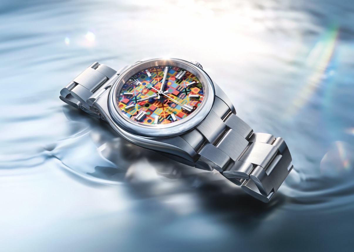 Eksplorasi yang lebih ekspresif hadir pada Oyster Perpetual 36. Dial lacquer berwarna dengan motif Jubilee membentuk komposisi huruf Rolex yang terasa ringan, tetapi dibangun melalui proses yang sangat akurat. Setiap warna diaplikasikan satu per satu, menciptakan permukaan yang hidup tanpa kehilangan ketepatannya.