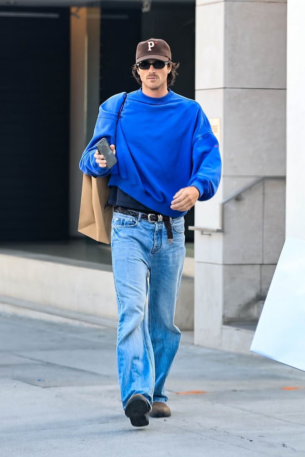 Aktor itu tampil santai namun stylish saat keluar untuk berbelanja akhir pekan ini di Los Angeles, mengenakan crewneck sweatshirt berwarna cerulean yang sangat cerah. Ia kemudian memadukannya dengan T-shirt hitam klasik serta slightly baggy blue jeans dengan sentuhan light, vintage wash.