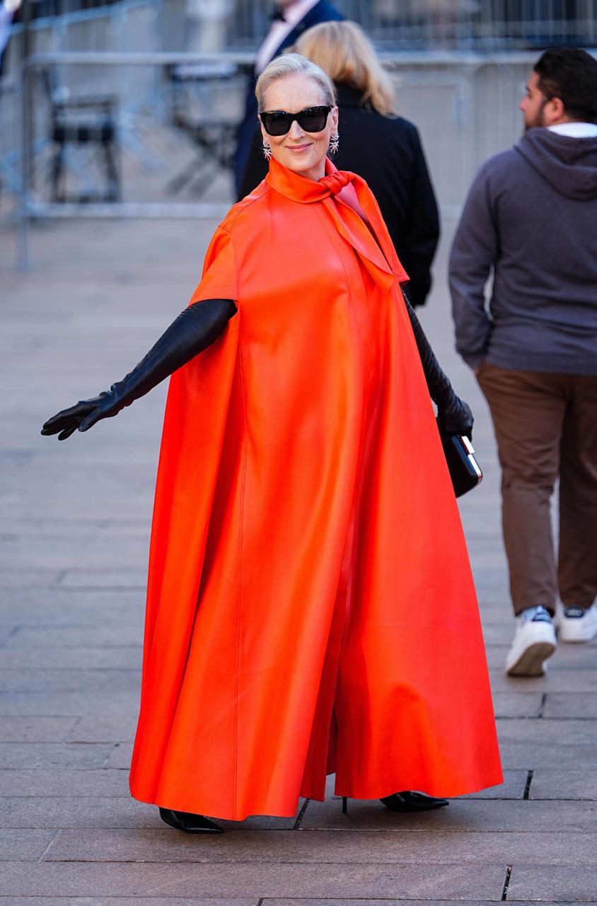 Namun, gaun-gaun mini yang menghiasi karpet merah jauh lebih kasual daripada gaun-gaun tahun 2026 yang muncul di David Geffen Hall tadi malam—perbandingan yang paling terasa pada penampilan para aktor utama. Anne Hathaway, misalnya, mengganti gaun merah panjangnya dengan gaun bervolume dengan potongan pinggang rendah dalam warna yang sama. Di sebelahnya, Meryl Streep mengganti setelan kremnya dengan jubah merah Givenchy yang berani dari koleksi Fall/Winter 2026 Sarah Burton.