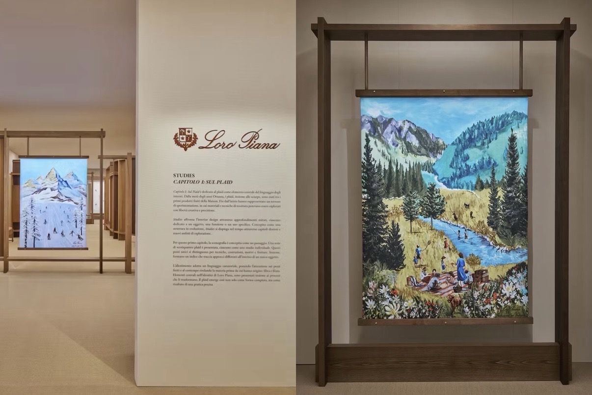 Loro Piana memusatkan perhatian pada plaid di Cortile della Seta. 23 tekstil disusun dalam jalur linear, masing-masing memperlihatkan kombinasi serat seperti vicuña dan baby cashmere, serta teknik seperti embroidery dan handloom weaving. Material menjadi inti dari pengalaman.