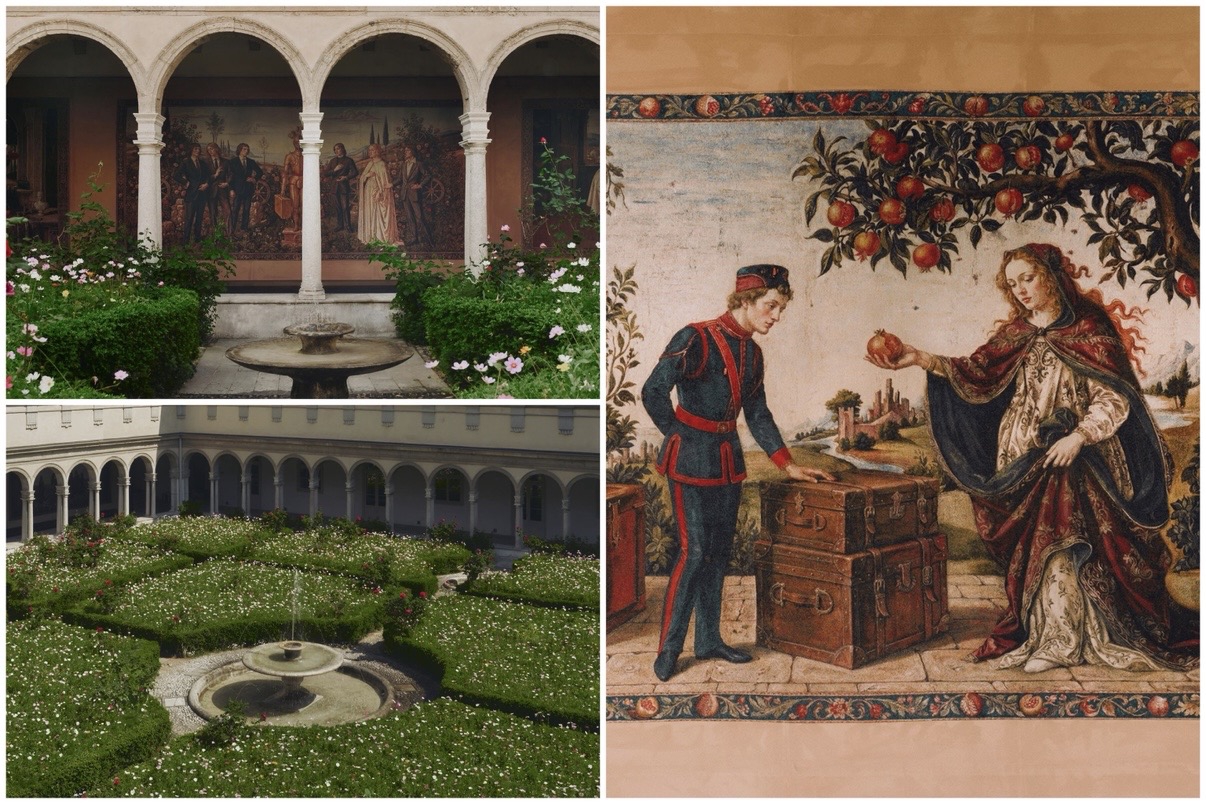 Gucci membangun Gucci Memoria di Chiostri, San Simpliciano. Tapestry berskala besar menarasikan perjalanan brand sejak era Guccio Gucci, sementara taman dengan bunga musiman menghidupkan motif Flora khasnya. Di sudut lain, vending machine menjadi objek kecil yang terasa personal.