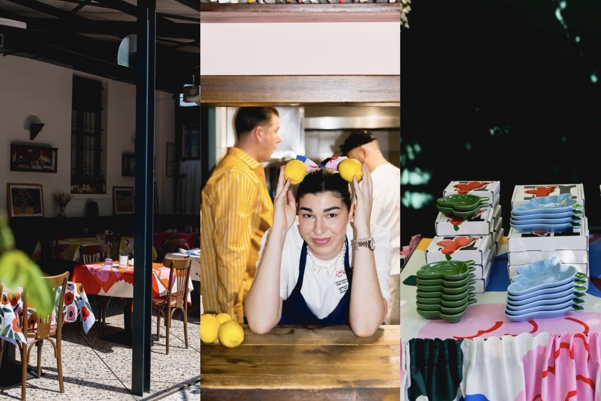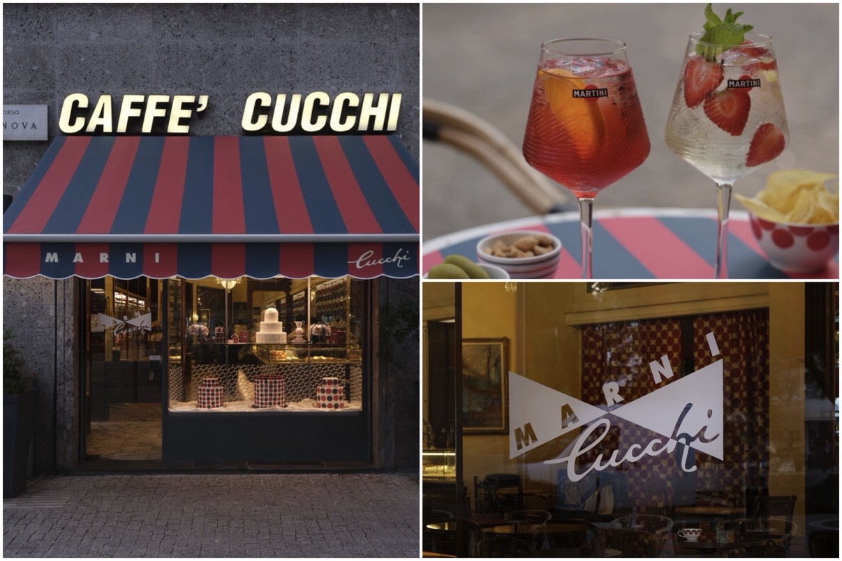 Marni menghidupkan kembali Pasticceria Cucchi melalui kolaborasi Marni x Cucchi. Motif merah dan hijau bergaya retro hadir di seluruh ruang, dari tableware hingga seragam staf. Dari cappuccino pagi hingga aperitivo, ruang ini mengikuti ritme keseharian kota.