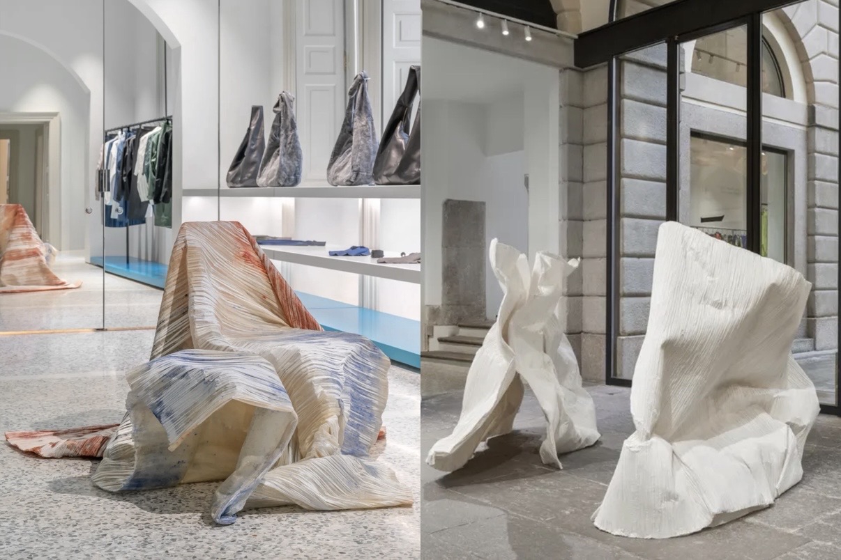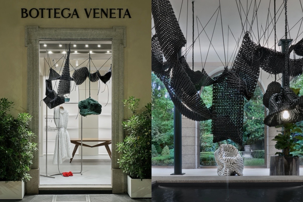 Bottega Veneta mengeksplorasi material melalui Lightful bersama Kwangho Lee. Anyaman kulit digantung dalam bentuk organik dengan palet hitam dan hijau yang dalam. Cahaya turut mempertegas teksturnya, memperlihatkan detail yang biasanya tersembunyi.