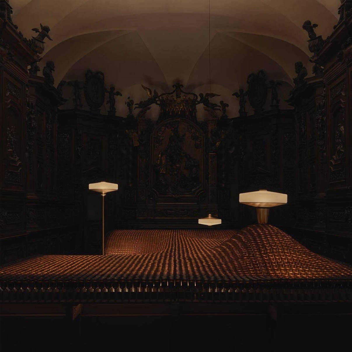 Aesop menghadirkan The Factory of Light di Chiesa del Carmine. Fasad trompe l’oeil disusun ulang menjadi lanskap kota, mengarah pada proses pembuatan lampu Aposē dari forging kuningan hingga glass-blowing. Cahaya menjadi penghubung antara material dan proses.
