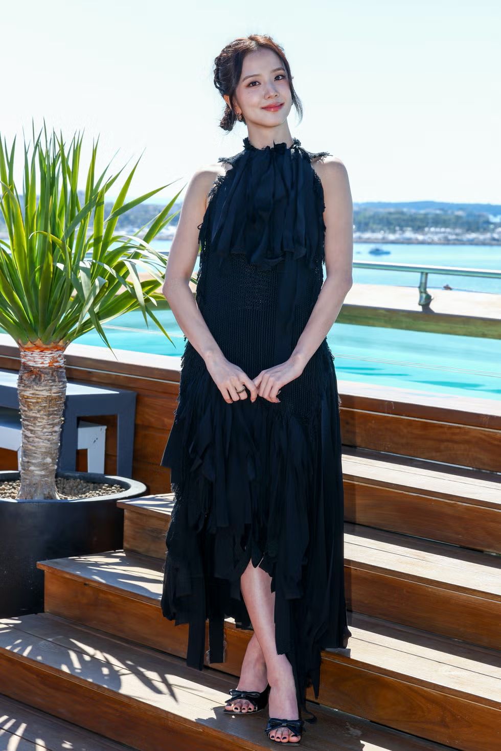 Selanjutnya, sang bintang berhenti sejenak untuk sesi foto di Majestic Hotel Barriere dengan busana Dior hitam, yang dirancang oleh Jonathan Anderson untuk koleksi Fall 2026. Baik pada garis leher tinggi maupun pinggang rendah, pita-pita yang ditempatkan secara acak memberikan kontras lembut pada tepi kasar dan mentah dari dasar tenunan, dan menciptakan garis hem asimetris yang menambahkan sentuhan effortless.
