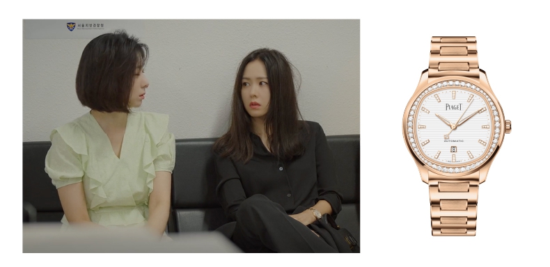 Label jam tangan terkemuka Piaget diperlihatkan secara elegan oleh karakter Son Ye-jin, Cha Mi-jo. Menampilkan desain mewah dengan case 18K rose gold yang dihiasi 96 berlian, jam tangan ini memberikan total sekitar 1.05 karat dan dilengkapi dengan dial yang elegan, juga mesin gerakan mekanik otomatis Manufacture 500P1.