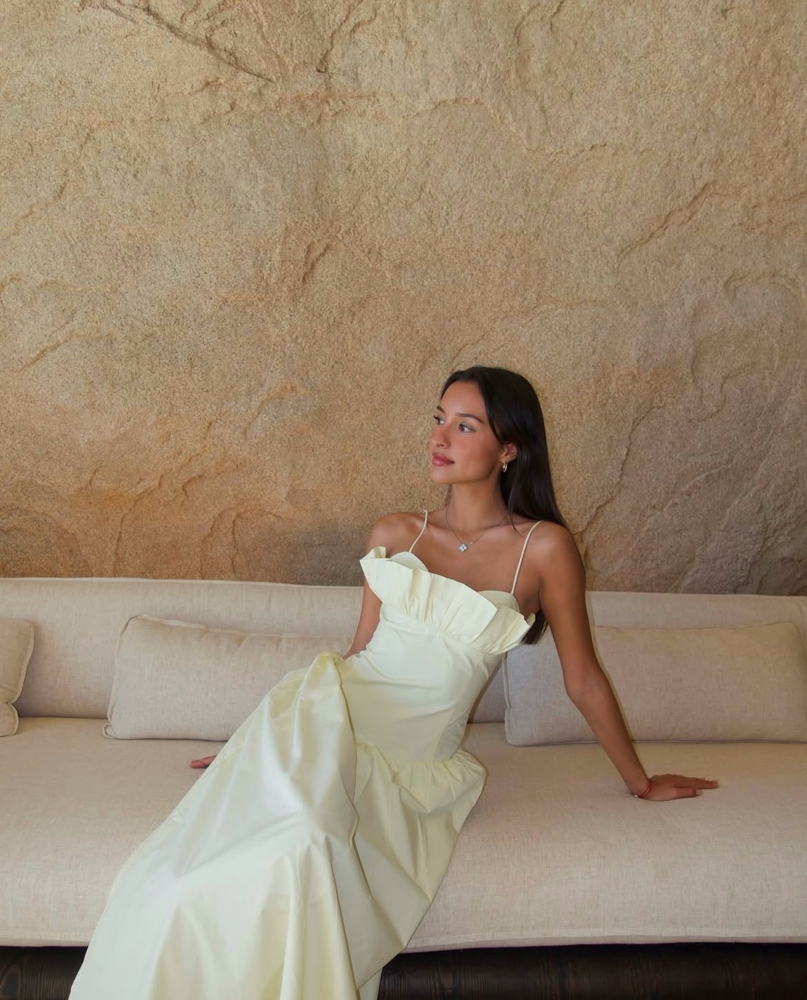 Femininitas adalah benang merah dalam gaya Alexandra, dan ia kerap memilih busana yang menonjolkan detail kecil namun berpengaruh besar. Salah satunya adalah gaun kuning dengan tali spaghetti dan aksen lembut di bagian dada. Potongan sederhana ini justru memberi ruang bagi aura natural Alexandra untuk bersinar, menjadikan tampilannya terasa ringan, segar, dan sangat autentik. Ini bukti bahwa keanggunan bisa hadir lewat hal-hal kecil yang subtil namun bermakna.