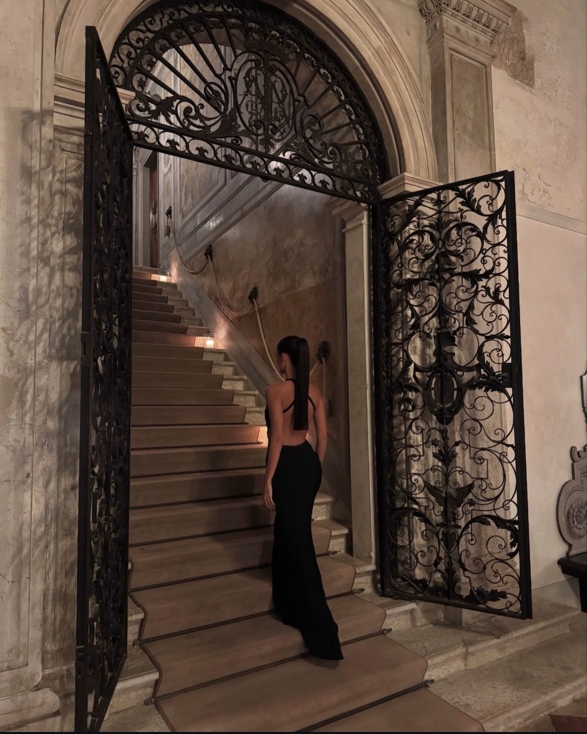 Untuk momen malam yang lebih intim atau formal, Alexandra kerap memilih gaun dengan detail backless yang sensual namun tetap elegan. Dalam salah satu tampilannya, ia mengenakan dress dengan punggung terbuka dan detail lace di bagian depan—sebuah kombinasi yang menyampaikan sisi glamor yang tidak terlalu lantang. Gaya ini menekankan pesona yang tenang namun penuh daya tarik, menghadirkan kesan luks yang melekat kuat tanpa perlu usaha keras.