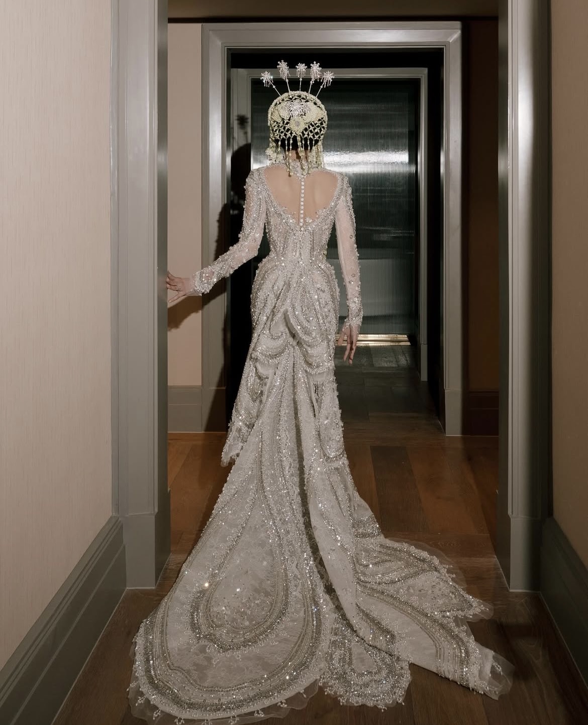 Memasuki momen puncak akad nikah, Alyssa mengenakan gaun megah rancangan Tex Saverio yang langsung mencuri perhatian publik. Dengan potongan klasik dan siluet panjang menjuntai hingga lantai, gaun ini dilapisi payet gemerlap yang menciptakan kilau luks tanpa kesan berlebihan. Glamor yang dihadirkan begitu terkontrol, menampilkan elegansi yang modern namun tetap mengakar pada esensi pernikahan tradisi Sunda. Dipadukan dengan siger Sunda karya Rinaldy Yunardi, tampilan Alyssa terasa begitu harmonis, everything just falls into place.