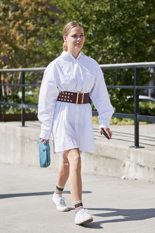 Imbuhkan penggunaan ikat pinggang berukuran besar pada shirt dress rona putih agar tampilan kasual Anda tidak terlihat monoton. Lalu, tambahkan penggunaan sepatu kets warna putih yang diharmonisasikan bersama kaus kaki bercorak senada dengan ikat pinggang untuk memperkaya gaya.
