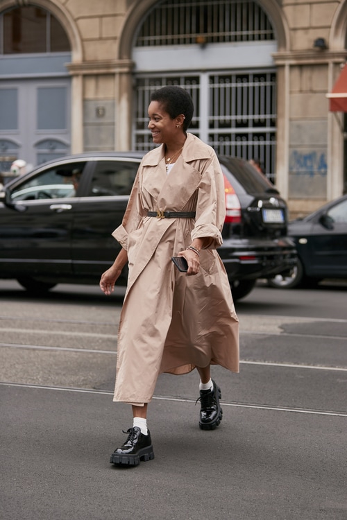 Busana berona netral merupakan pilihan yang nyaman untuk dikenakan sehari-hari. Berilah ikat pinggang berwarna hitam, kaus kaki dengan tinggi 5cm dari mata kaki berona putih, dan sepatu bersol tinggi dalam palet hitam sebagai pernyataan mode.