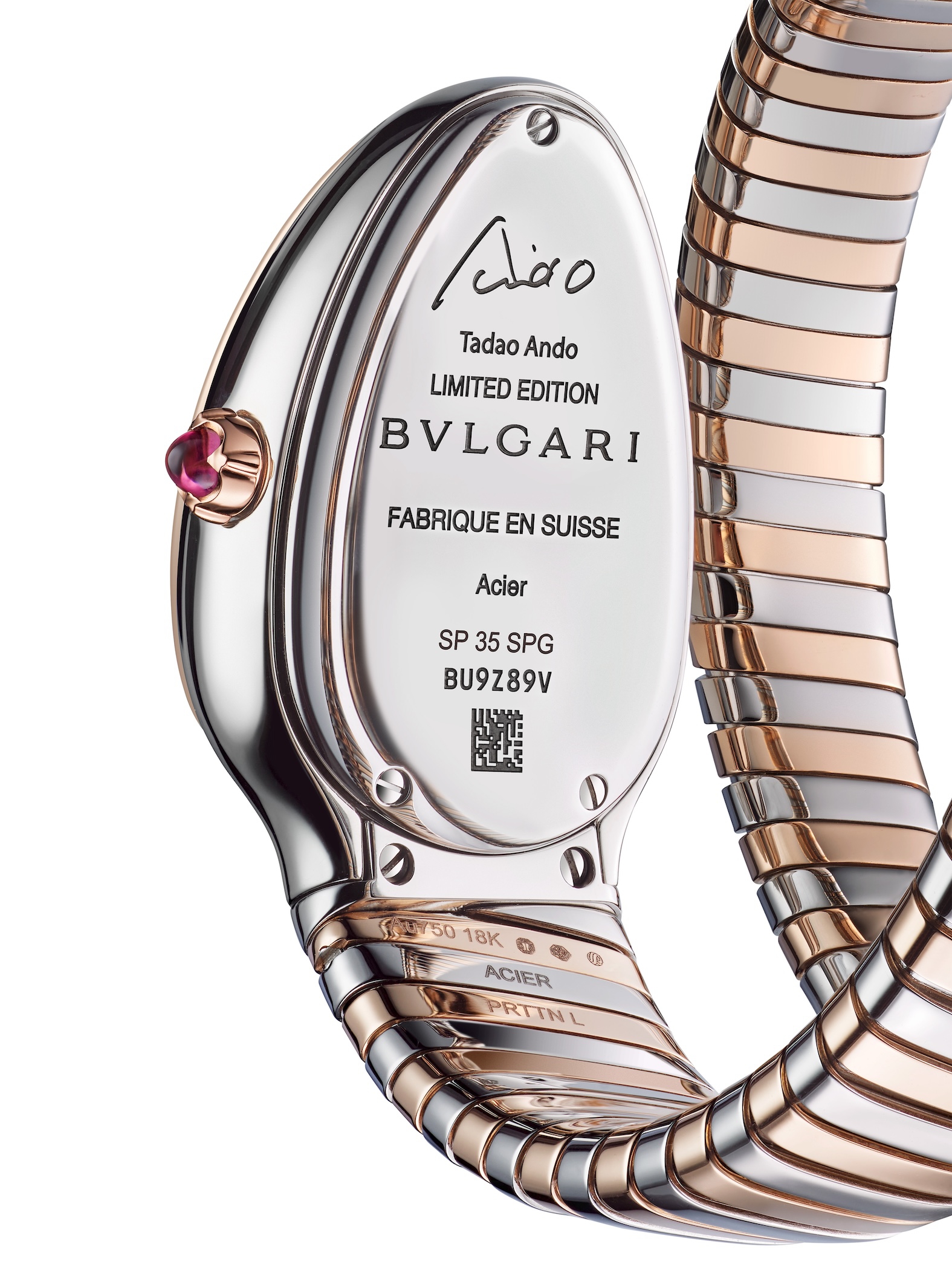 Kolaborasi Tadao Ando dengan Bvlgari Serpenti adalah sebuah mahakarya yang menggabungkan keindahan arsitektur dan keahlian perhiasan dalam sebuah karya seni yang tak lekang oleh waktu. Setiap edisi terbatas hadir dalam kotak khusus yang dirancang dan ditandatangani oleh Tadao Ando, sebuah detail yang juga terukir di bagian belakang setiap jam tangan.