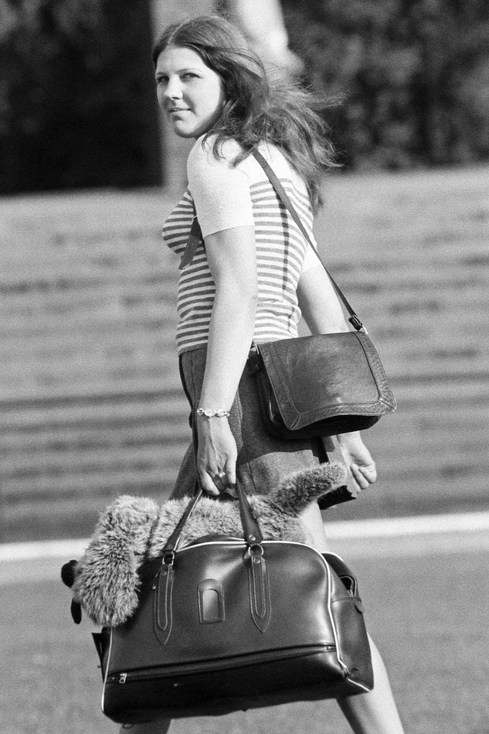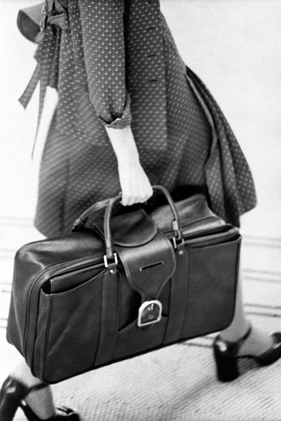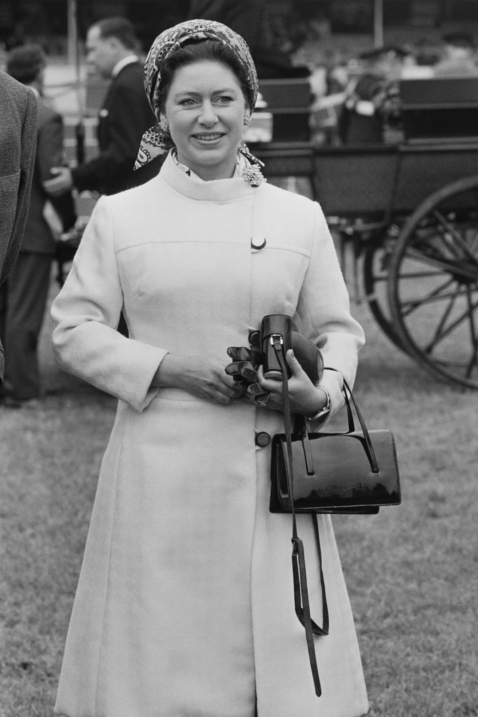 Putri Margaret dan sejujurnya, hampir seluruh anggota keluarga kerajaan, selalu membawa tas tangan setiap kali bepergian, seperti yang terlihat pada tas berbahan kulit paten ini. Material tersebut merupakan bagian penting dari tren fesyen Inggris pada tahun 1960-an dan bahkan semakin populer di dekade berikutnya.