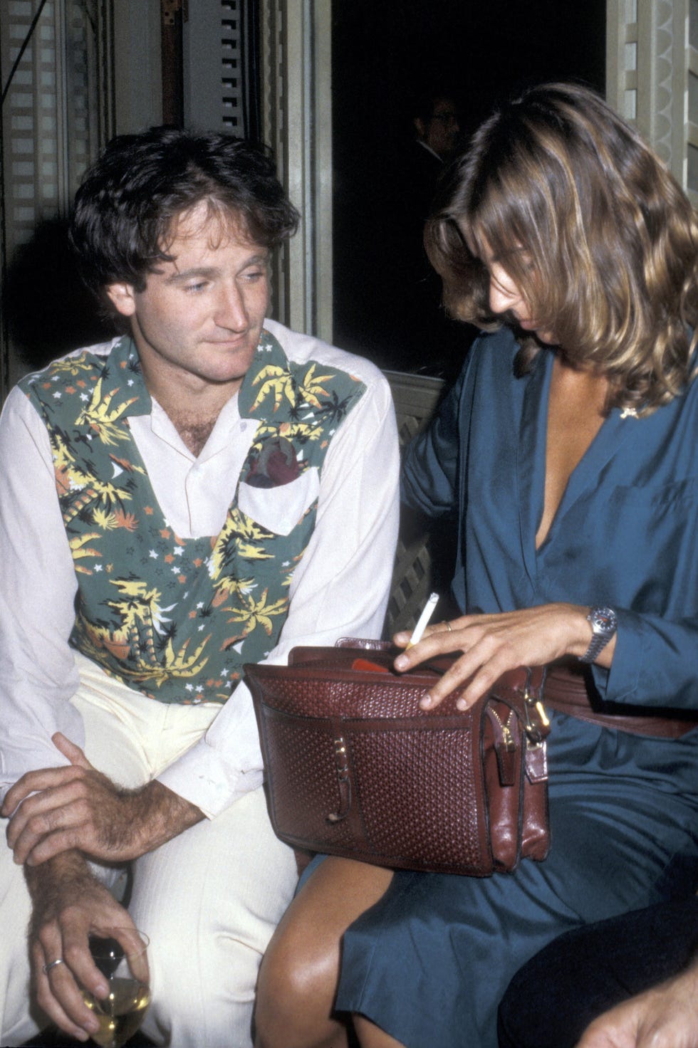 Tas kulit anyaman mengikuti tren tas jerami, seperti yang terlihat pada Valerie Velardi, istri Robin Williams saat itu.