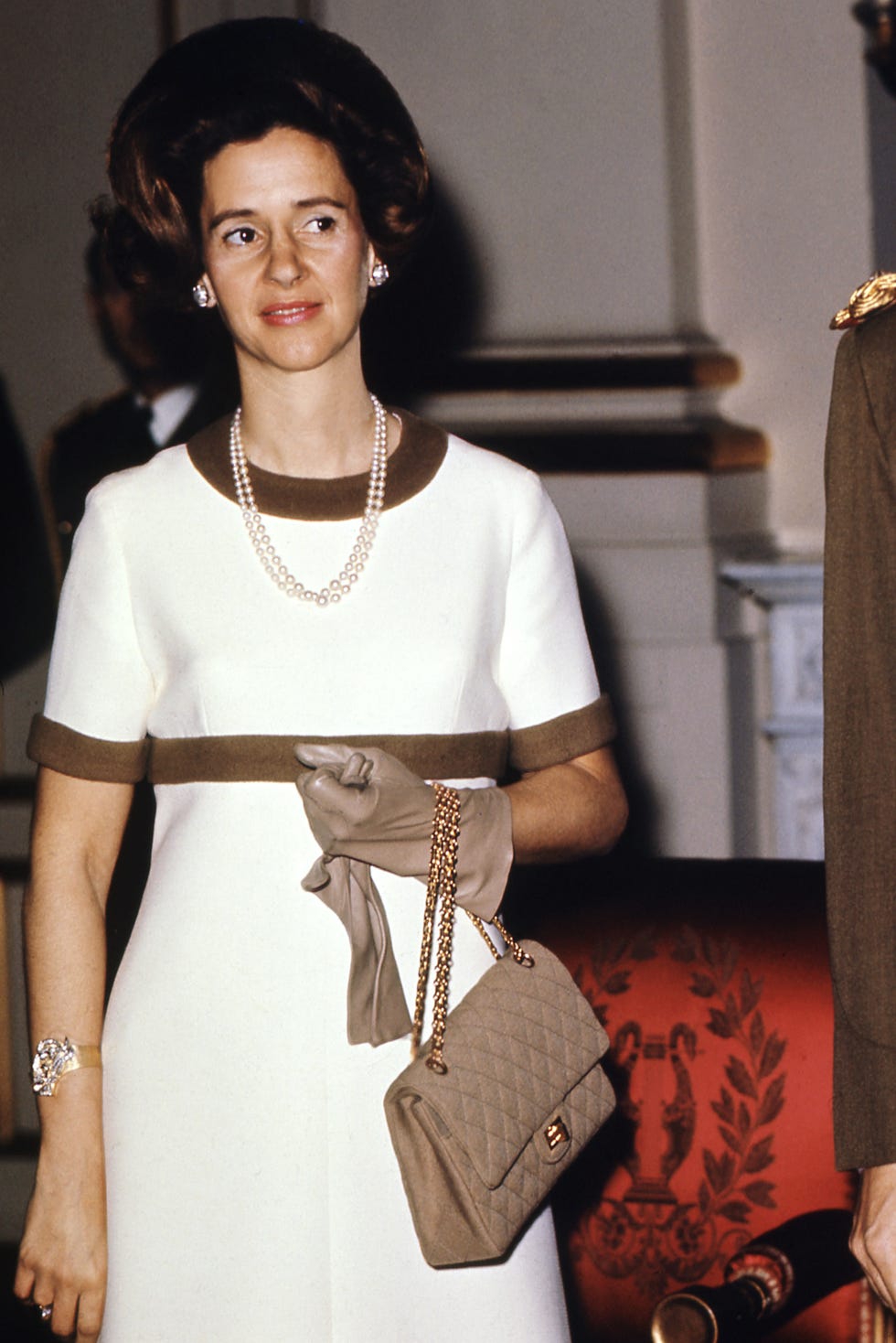 Tas berwarna beige dan netral mulai populer berikutnya. Masih dalam lingkup keluarga kerajaan, Ratu Fabiola dari Belgia membawa tas ini saat menjalankan tugas resmi bersama Raja Baudouin. Ia bahkan memadukannya dengan sarung tangan kulit miliknya.