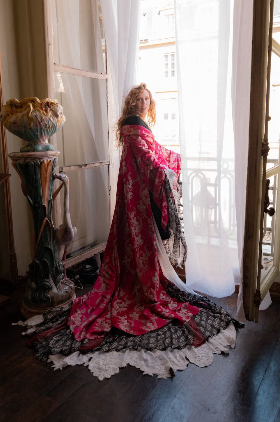 Miley menjadi orang pertama yang mengenakan tampilan ini sejak debutnya di runway Jean Paul Gaultier couture Spring 2002, dan belum pernah keluar dari arsip sejak saat itu. Ensembel ini terdiri dari midi dress hitam off-the-shoulder yang dilapisi cape sutra merah dengan sulaman bunga emas. Di bawahnya, terdapat jubah hitam mengalir dengan motif daun emas dan trim renda putih.