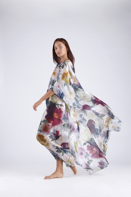 Kaftan dengan aksen drapery yang dibubuhi motif bebungaan nan manis untuk aktivitas sehari-hari.