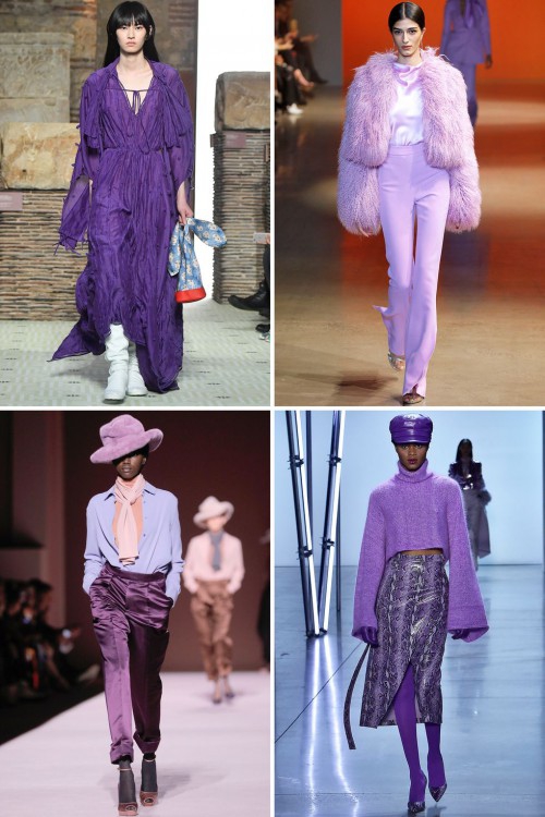 Warna ungu sudah menjadi warna yang disukai pencinta fashion sejak lama, namun kali ini ia kembali menjadi shade of the season. Tak tanggung-tanggung, dari mulai warna ungu pastel hingga ungu tua mendominasi musim gugur 2019. Warna ini mendominasi dalam bentuk dress, mantel, sweater dan bahkan topi.