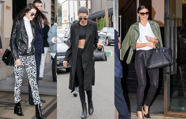 Model Bella Hadid memilih celana legging bermotif untuk ia padankan dengan atasan turtle neck dan luaran jaket kulit. Ia kemudian mengaplikasikan skema warna hitam dan putih sehingga seluruh penampilannya tampak selaras dan rapi meski mengenakan celana legging yang dikenal sebagai celana untuk berolahraga.
