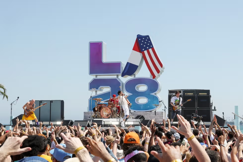 Setelah bendera Olimpiade diserahkan kepada Los Angeles, Red Hot Chili Peppers, band ikonis kota tersebut, langsung menggetarkan panggung dengan lagu populer mereka, “Can’t Stop.”